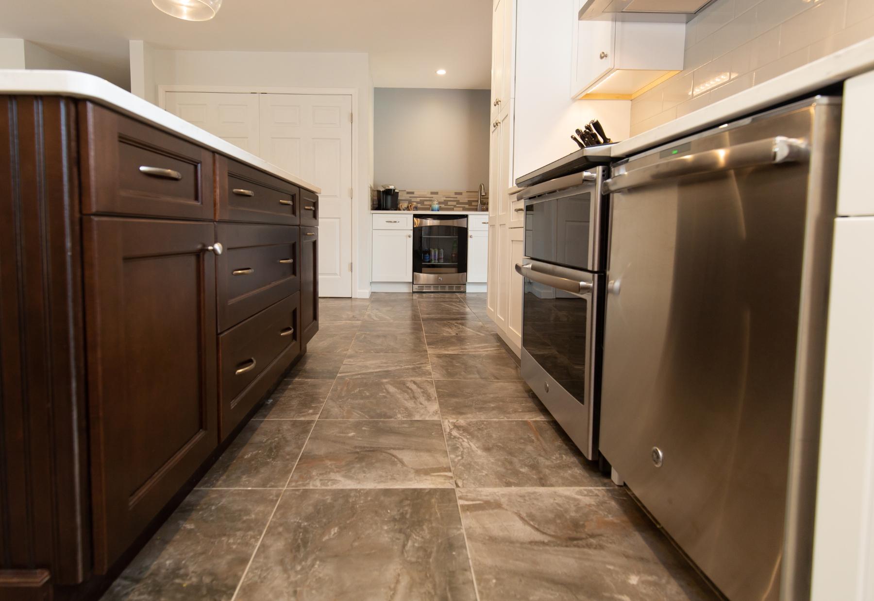This custom kitchen redesign in Saratoga NY features large format tiles that blend warm and cool tones for a cohesive design. White cabinetry paired with Calacatta quartz countertops creates an elegant foundation, while deep wood tones in the island add richness. Stainless steel appliances and fixtures elevate the kitchen’s modern appeal, while a separate bar area with a mini fridge ensures easy entertaining. Seeded glass island pendants add a touch of sophistication, making this kitchen a true centerpiece of the home.